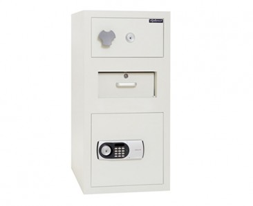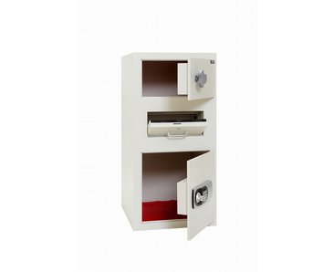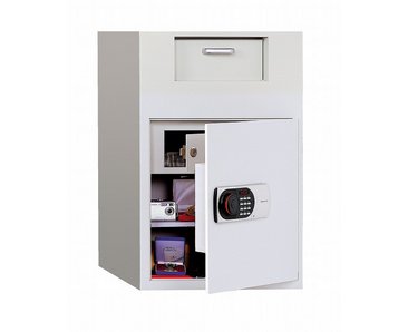 上部の扉から投入し下段から回収を行う投入式金庫。多機能のデジタルテンキーロックを搭載し、全機種セキュリティに配慮した警報アラームや覗き見防止機能付き。